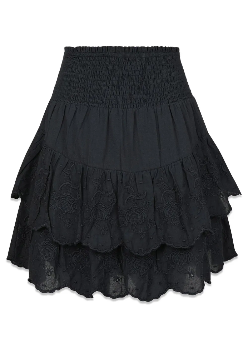 - Kort nederdel med smukke blomsterdetaljer på flæserne