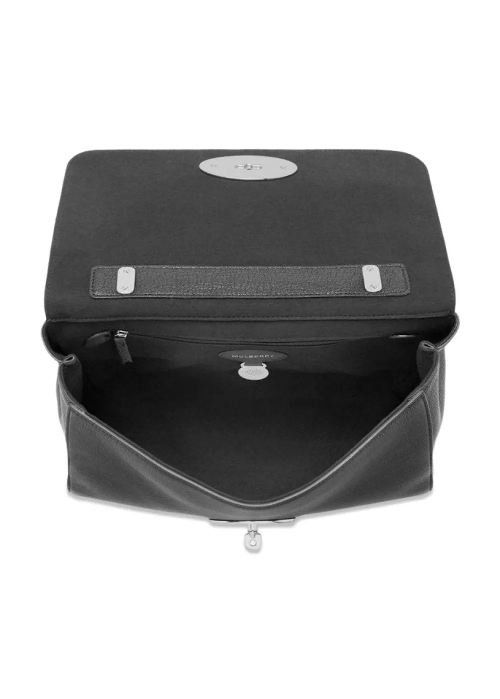 Medium Lily Glossy Goat er en taske i farven black-silver toned fra Mulberry. Den har den ikoniske Postman’s Lock, skulderrem af læder og kæde, et rum og indvendig lomme.