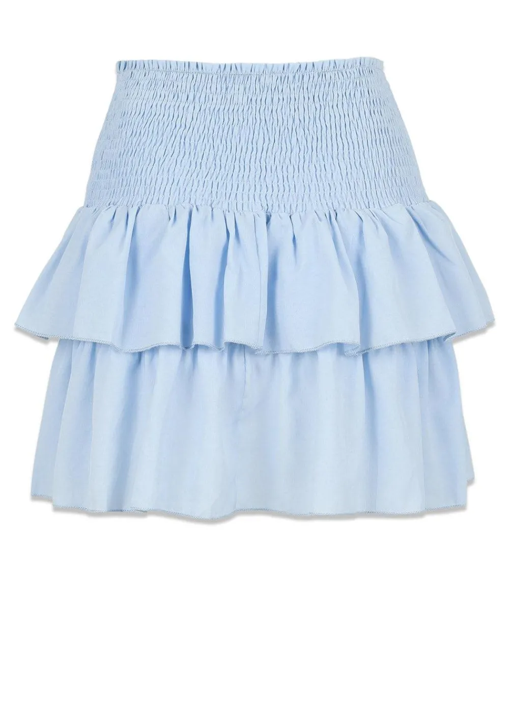 Carin er en lyseblå nederdel fra Neo Noir med kort længde og bred smock i livet. Nederdelen har flæsedetalje og løs pasform og kan både styles som en nederdel og top.